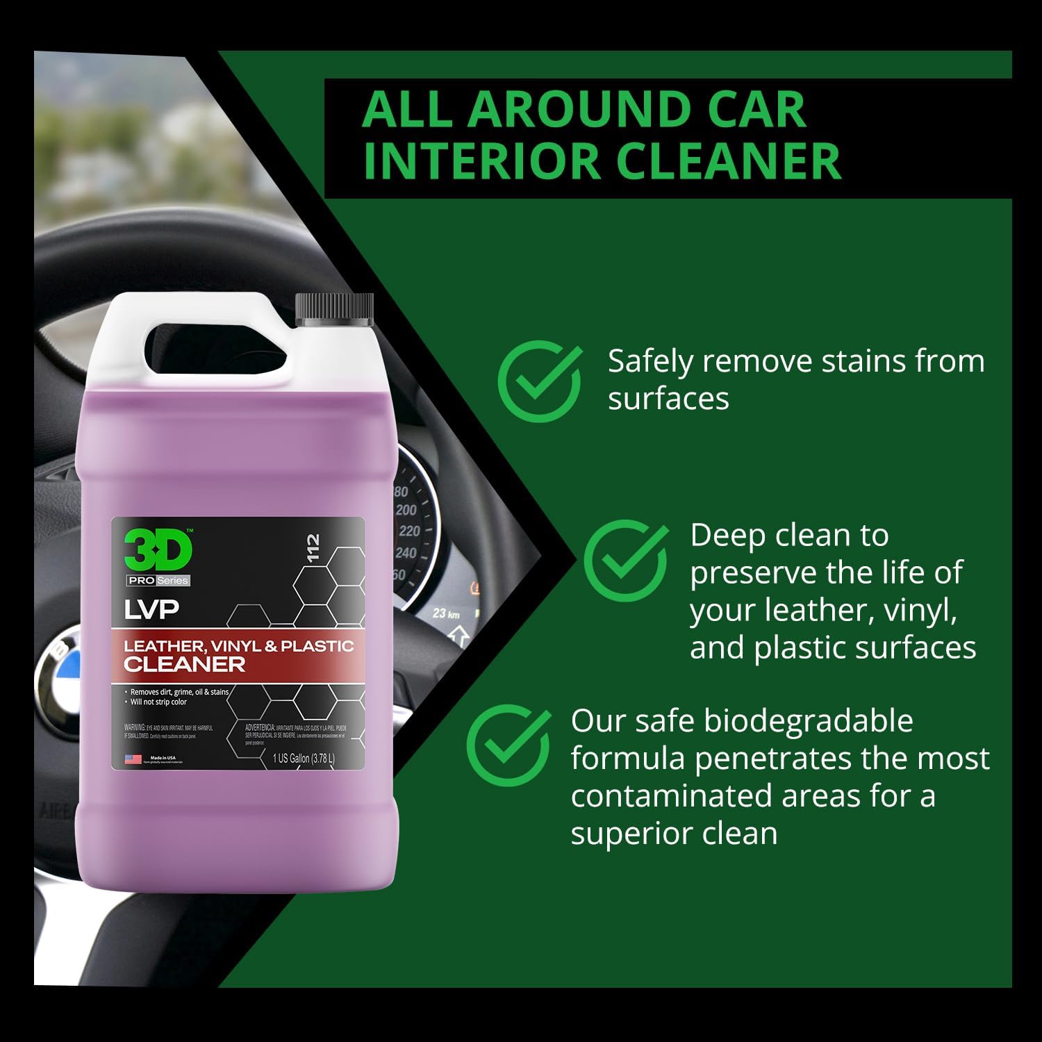 3D LVP Interior Cleaner - Removes Dirt, Grime, Grease, Oil & Stains from Leather, Vinyl & Plastic - Great for Seats, Steering Wheels, Door Panels, Dashboards - Car, Office, Home Use - 1 Gallon
