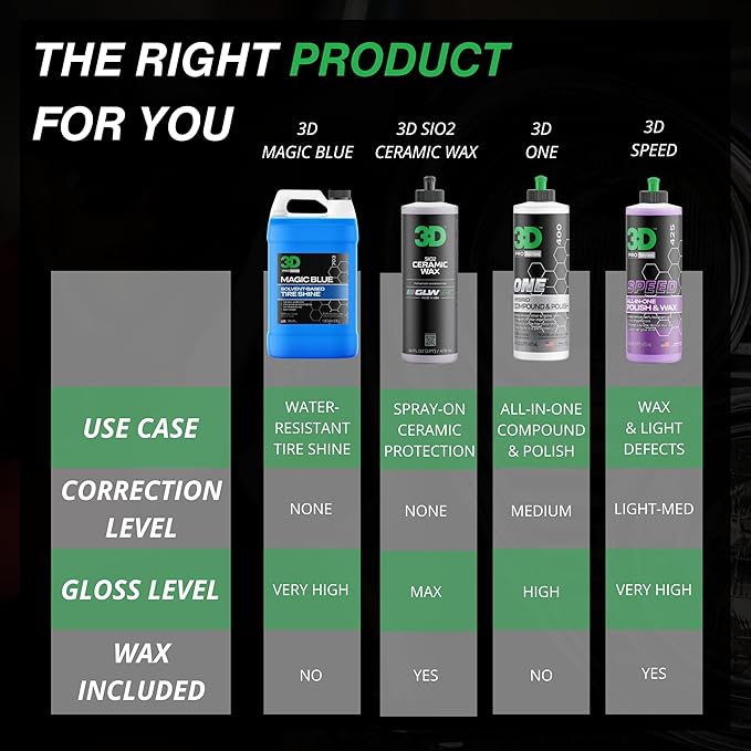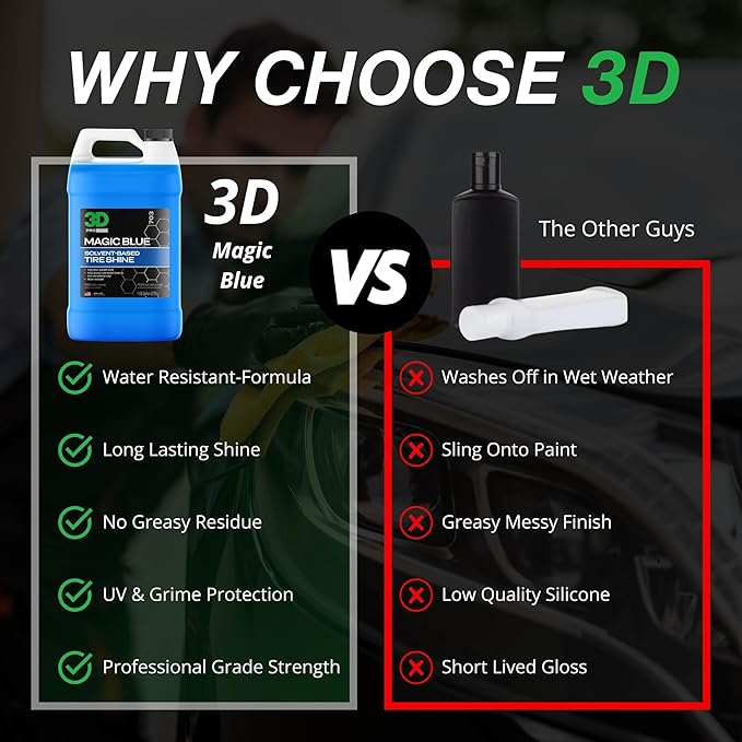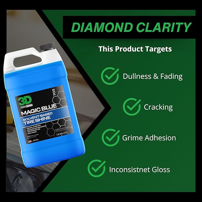 - Water Repellant Rain Ready Protection: 3D Magic Blue is a solvent-based tire shine that repels water and road spray. Perfect for wet conditions, this high-gloss formula clings to rubber and plastic, giving your tires a deep, black shine that stays put, rain or shine