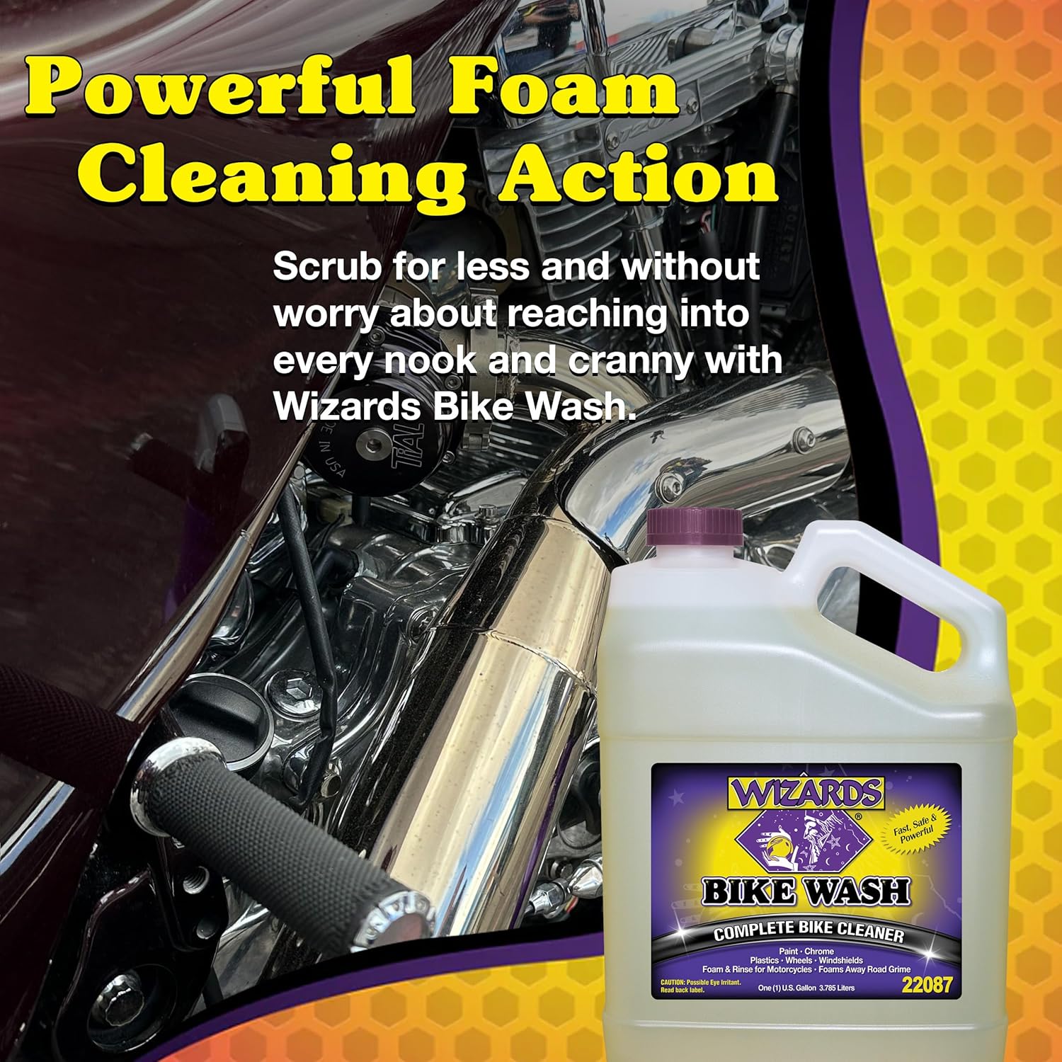 - Powerful Foam Cleaning Action: Scrub for less and without worry about reaching into every nook and cranny with Wizards Bike Wash. Our motorcycle wash's formula’s unique foaming action cleans without you needing to scrub. It works well as an all-round cleaner for chrome, aluminum, wheels, and engines. It is also safe for clear coats and windshield plastic.