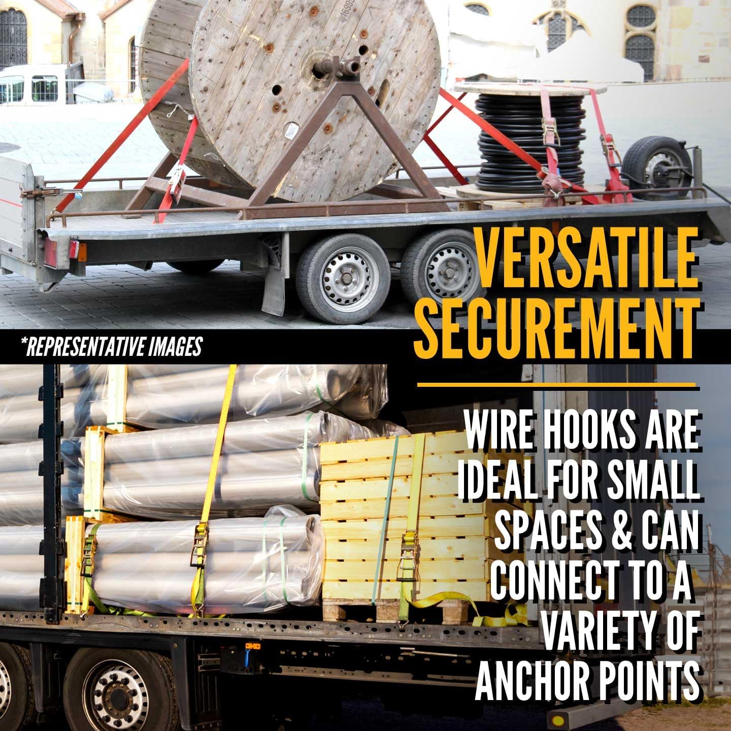 - HEAVY DUTY TIE DOWN STRAPS - Our 2 inch straps with hooks offer supreme quality with a break strength of 10,000 lbs. and working load limit of 3,333 lbs. These assemblies include durable double J-hooks for versatile attachment and strength.