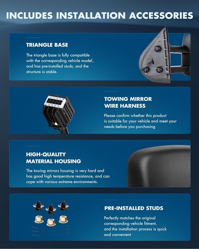 - 🎁【WHAT YOU GET】 - A Pair of Towing Mirrors(Include Left Side and Right Side) and 1 Year Warranty.