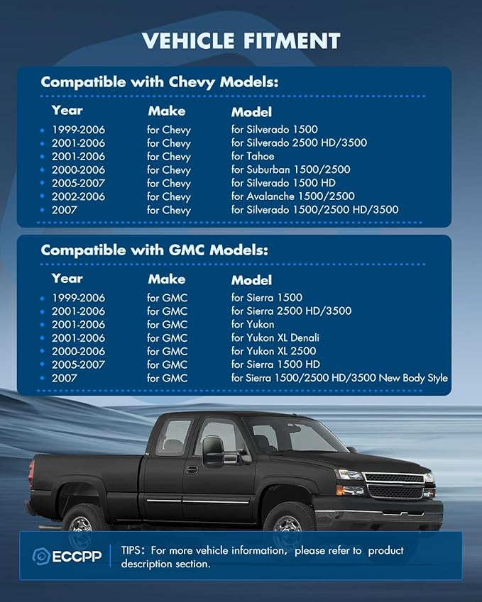- Material Glass, Plastic : Vehicle Service Type 1999 2000 2001 2002 2003 2004 2005 2006 for Chevy for Silverado for GMC for Sierra Pickup Truck 1999 2000 2001 2002 2003 2004 2005 2006 for Chevy for Silverado for GMC for Sierra Pickup Truck See more