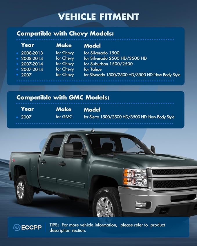 - š Fitment: 2007-2013 for Chevy for Avalanche for Tahoe for Suburban 1500 2500 for GMC for Sierra for Denali 1500/for Yukon/for Yukon XL 1500 2500 ,2008-2013 for Chevy for Silverado/1500/2500 HD/3500 for GMC for Sierra 1500/2500 HD/3500, 2007 for Chevy for Silverado 1500/2500 HD/3500 for GMC for Sierra 1500/2500 HD/3500 New Body Style ,2011-2013 for GMC for Sierra for Denali 2500/3500 HD ,2009-13 for Chevy for Silverado for Hybrid/for GMC for Sierra for Hybrid.