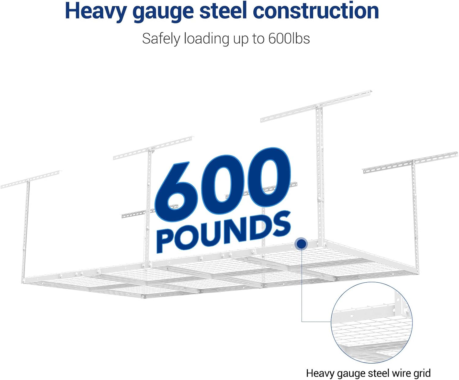 - 1200 lbs Tested, 600 lbs Rated: Our overhead garage storage rack undergoes rigorous double load testing (1200 lbs) to ensure unmatched safety and durability, supporting up to 600 lbs for your tools and equipment.