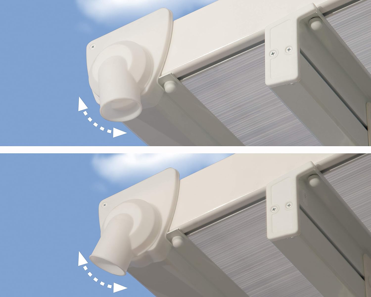 - INTELLGENT DESIGN THAT PROTECTS AGAINST MORE THAN JUST HARMFUL UV RAYS - Front aluminum gutter directs rainwater to the side for additional protection from the elements. Adjustable wall mounting plate for flexibility in positioning of roof slope enabling better snow and rain runoff.