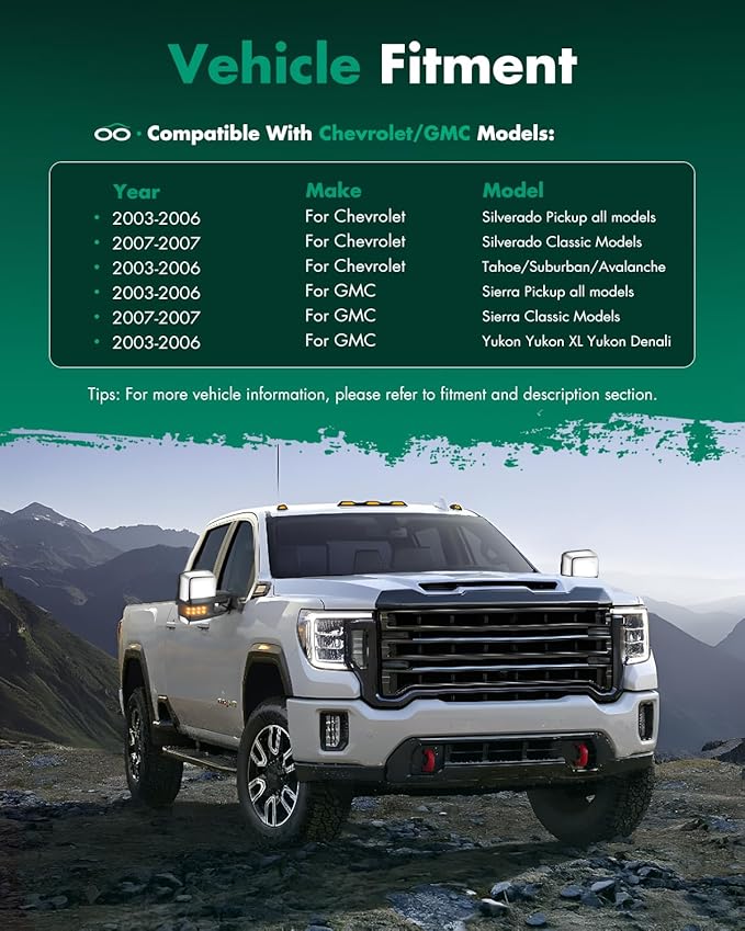 - [Tow Mirror Fitment]: Compatible with 2003 2004 2005 2006 For Chevy For Silverado 2007 For Chevy For Silverado (Classic ONLY) 2003-2006 For GMC For Sierra 2007 For GMC For Sierra (Classic ONLY) 2003-2006 For Chevy For Tahoe 2003-2006 For Chevy For Avalanche 2003-2006 For GMC For Suburban 2003-2006 For GMC For Yukon Yukon XL Yukon Denali 2003-2006 For Cadillac For Escalade all models