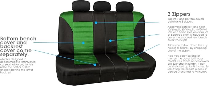 - π[SPLIT REAR BENCH COMPATIBLE] We designed our back seat cover to be fully compatible with 5/5, 4/6, or 6/4 split benches (or longer benches). The covers feature 3 zippers in the backrest AND bottom cover, and extra mesh side pieces so you can move your rear seat freely while getting full protection from the cover or use your rear arm rests.