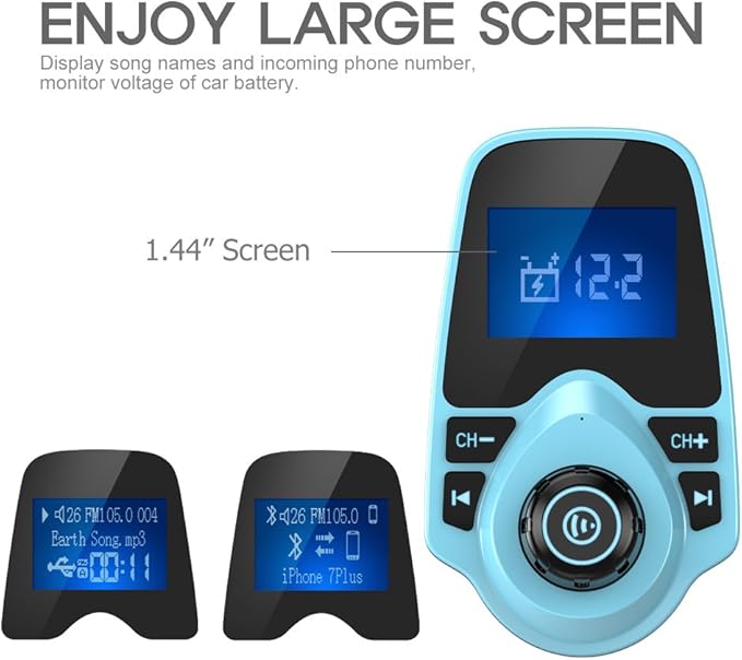 - 1.44 Inch LCD Display: Nulaxy KM18 Bluetooth FM transmitter has a 1.44 inch screen for better displaying information like phone calls, FM channels, music, car battery voltage, etc. The ideal screen size to assist you in driving safe without disturbance.