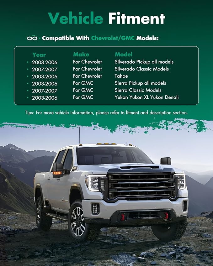 - š TOWING MIRRORS FIT - For 2003-2006 For Chevy Silverado Pickup all models/Tahoe/Suburban/Avalanche,For GMC Sierra Pickup all models/For GMC Yukon Yukon XL Yukon Denali,For Cadillac Escalade all models; 2007 For Chevy Silverado Classic Models,For GMC Sierra Classic Models