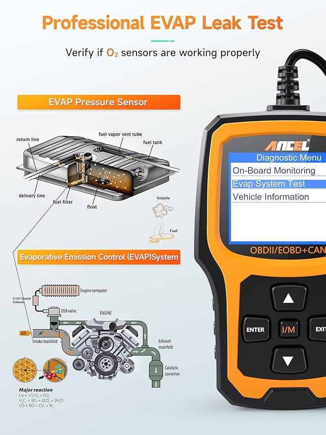 - ENHANCED OBDII DIAGNOSTICS – Comprehensive System Testing. This engine obd2 scanner diagnostic tool offers advanced diagnostics, including testing of O2 sensors and EVAP systems. Perform a leak test on your vehicle's EVAP system and monitor the fuel tank's integrity. The O2 sensor test helps fine-tune the air/fuel mixture, improving fuel efficiency and reducing emissions—saving you money at the pump and reducing your car's environmental impact. !!! Note: The AD410 is only an engine code reader, it DOESN'T support other systems such as ABS, SRS, Transmission and others.
