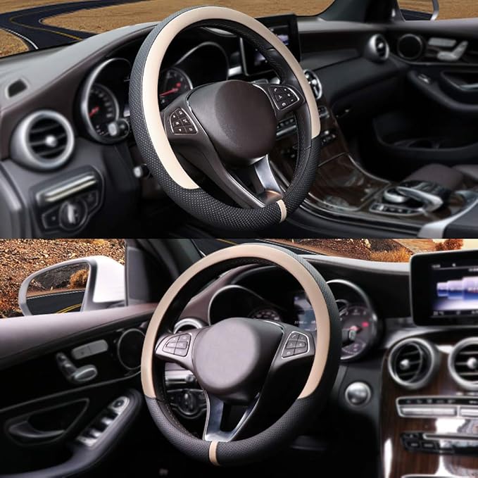COFIT Breathable Car Steering Wheel Cover 15 inch Auto Universal Leather Wrap Non-Slip Steeringwheel Protector Automotive Interior Accessories, Beige (Suit for 14.5-15 inch)