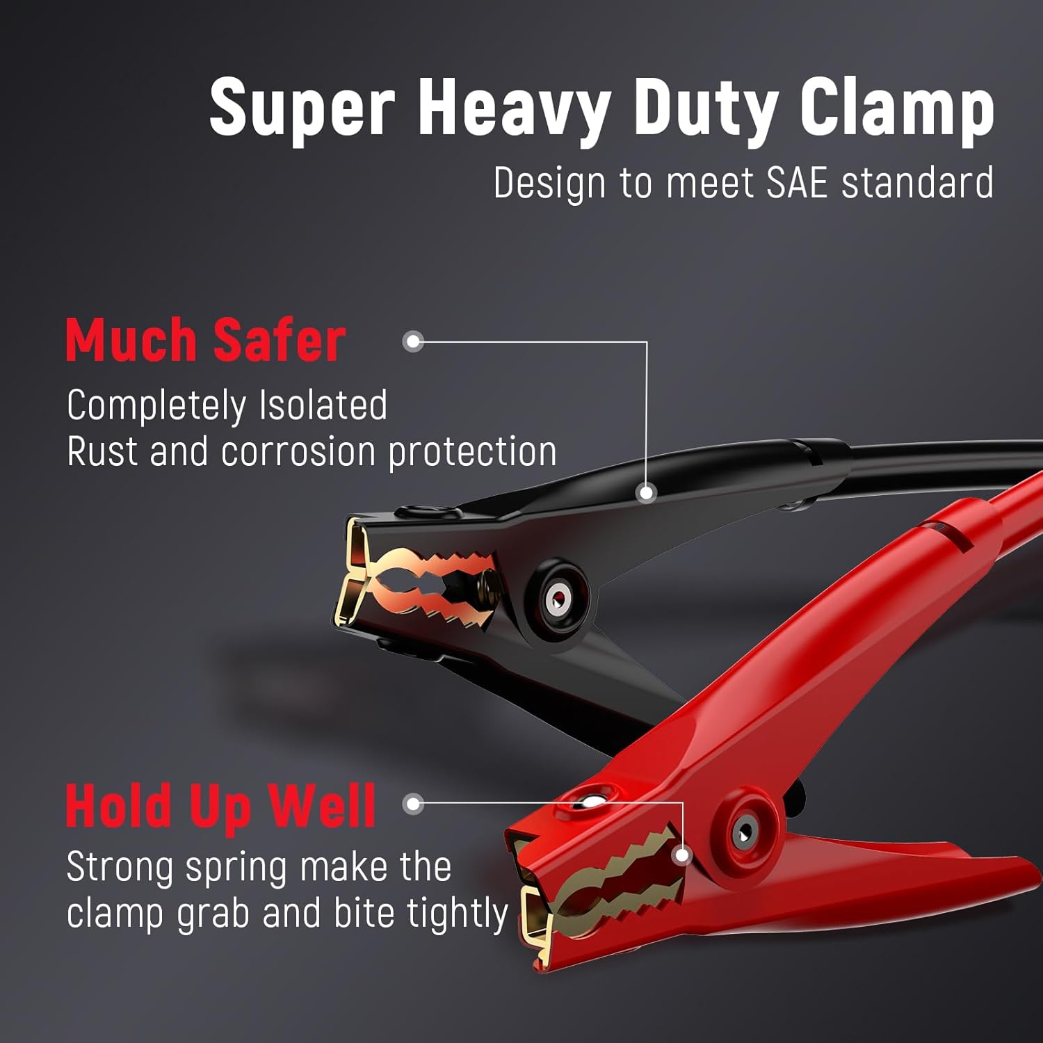 - Strong And Safe Clamps: The TOPDC Jumper Cables booster cable has four giant alligator clamps with strong jagged teeth and springs for excellent grip force. The jaws are strong and make connections easy. And the High Peak Jumper Cables has insulating rubber material to prevent electric shock and protect the safety of users. The clamps are engineered with reinforced structure and well-designed jaws that provide a firm, secure grip on both top-post and side-terminal batteries, ensuring long-lasting durability and ease of use.
