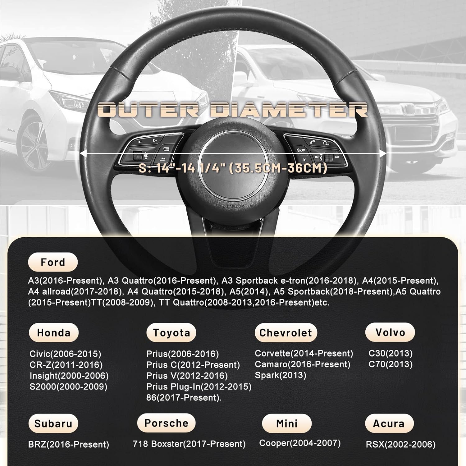- READY TO INSTALL: Warm up the steering cover, and slip it on your steering wheel. Installation is fairly easy, any adult can install this steering wheel cover. Suitable for small size steering wheels with outer diameter of 14-14 1/4 inches, please carefully measure the size of your steering wheel before purchasing.