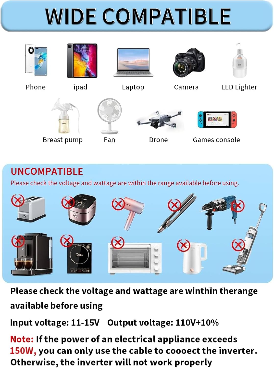 - [Multiple Protection Features] Safety is our top priority. The inverter is designed with multiple protection features, including overload shutdown, over-temperature shutdown, low voltage alarm, low voltage shutdown, high battery voltage shutdown, short circuit protection, and polarity reverse connection protection. Your devices and car battery are well-protected.