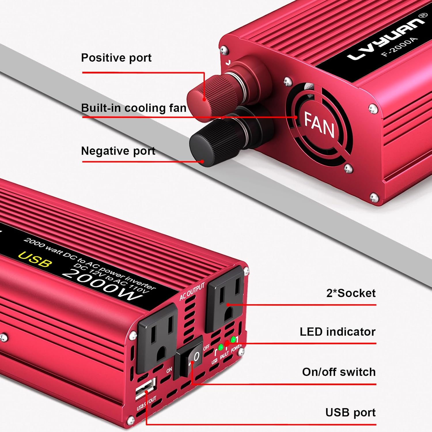 - [Unique Design with Enhanced Safety] Featuring an anodized aluminum case, USB port, built-in cooling fan, out-built fuse, and isolated ground neutral, our inverter combines functionality with durability and safety. The integrated smart cooling fan ensures silent operation while effectively reducing heat and preventing shortages.