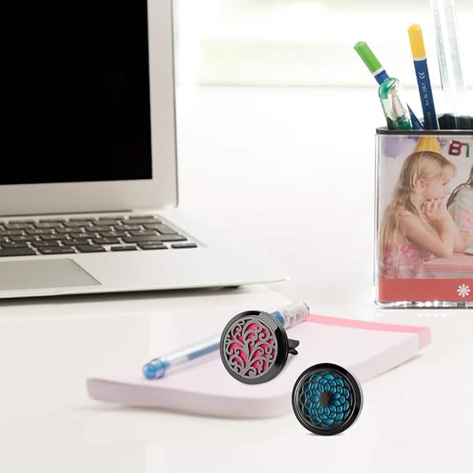 - Black color aromatherapy essential oil diffuser vent clip!!! You will get one 30MM Sunflower and one 30MM Tree of Life car diffuser with 22mm felt pads. Choose Two car diffusers to get more aroma.