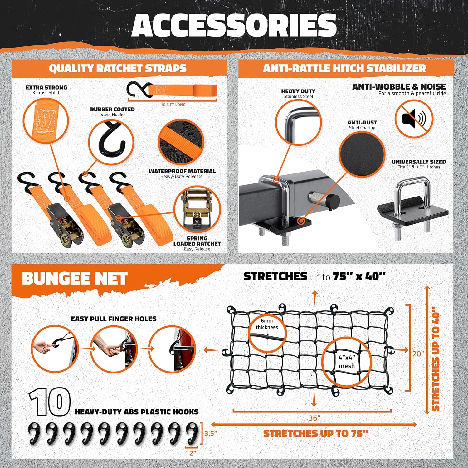- No More Loose Cargo: The Mockins Trailer Hitch Storage Rack Bundle includes 2 heavy-duty, 10-foot ratchet straps with spring-loaded latches for adjustable, stable attachment to your travel trailer hitch basket . This car hitch cargo carrier set also comes with a 6mm cargo net that stretches from 36"x20" up to 75"x40". Equipped with 10 ABS plastic hooks & built-in finger holes, fastening it over your hitch luggage rack is quick & easy. The set also works seamlessly as an RV cargo carrier .