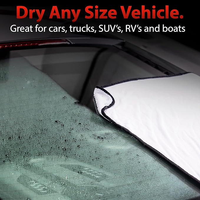 - ✅ A SAFE AND & EFFORTLESS WAY TO DRY YOUR CAR - This large slab of microfiber can absorb over a gallon of water and dry an entire car by itself. Think of the towel like a massive drying blanket for your car with premium silk-banding along all four edges. Drying your car with this towel is a breeze, with proven effective results, time after time.