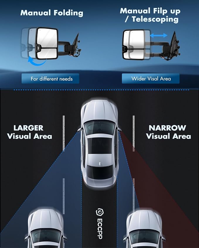 - Special Feature : Manual folding and telescoping,heated,Turn Signal light,Width light,Lens with LED light,with Chrome Housing Manual folding and telescoping,heated,Turn Signal light,Width light,Lens with LED light,with Chrome Housing