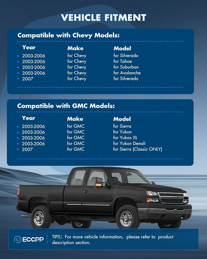 - Fitment: 2007 for Chevy for Silverado 1500 Classic 2003-06 for Chevy for Silverado 1500 2003 for Chevy for Silverado 1500 HD 2005-07 for Chevy for Silverado 1500 HD 2003-04 for Chevy for Silverado 2500 2003-06 for Chevy for Silverado 2500 HD 2007 for Chevy for Silverado 2500 HD Classic 2003-06 for Chevy for Silverado 3500 2007 for Chevy for Silverado 3500 Classic 2003-06 for Chevy for Suburban 1500 2003-06 for Chevy for Suburban 2500 2003-06 for Chevy for Tahoe
