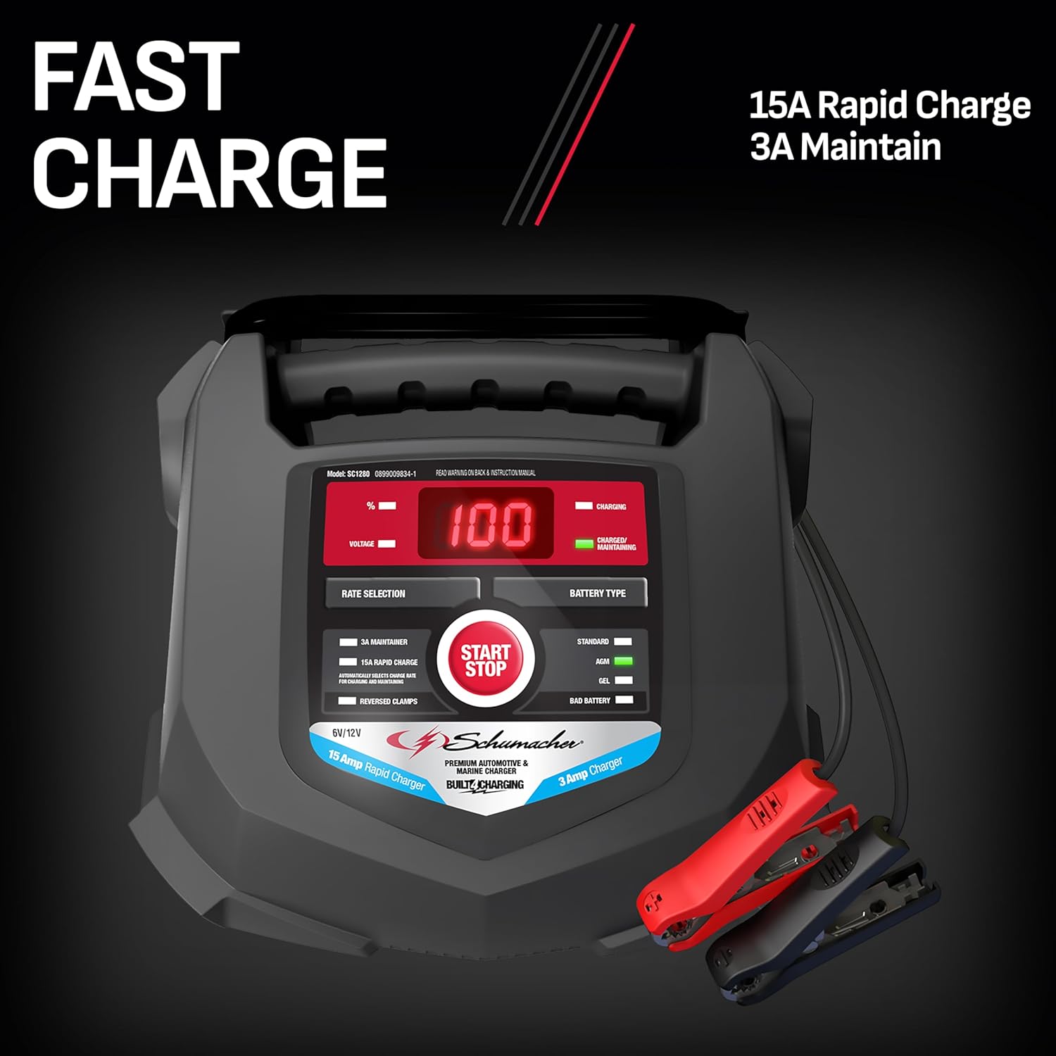 Schumacher Electric Car Battery Charger and Maintainer SC1280 4-in-1, 15 Amp, Fully Automatic for 6v and12v Automobile Batteries - Ideal for Motorcycles, Cars, Trucks, SUVs, Marine Batteries, and More