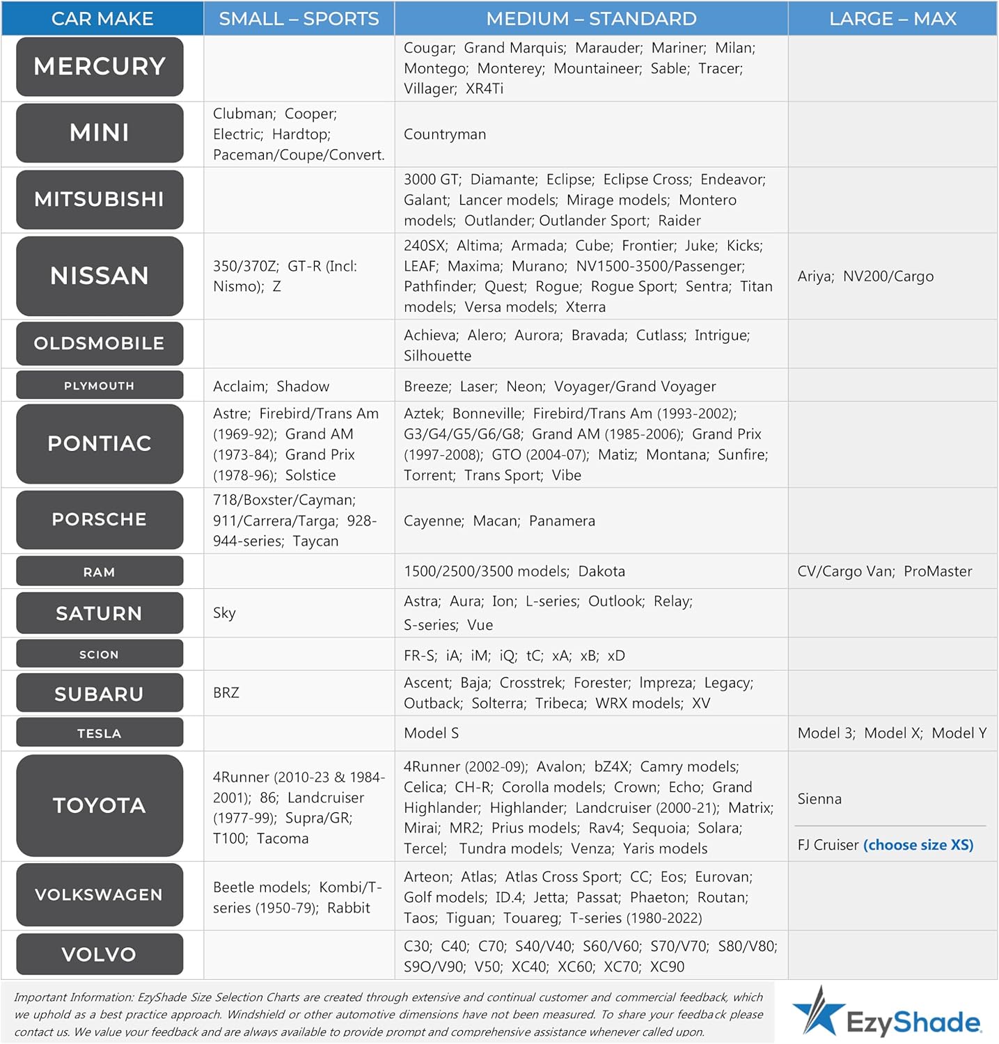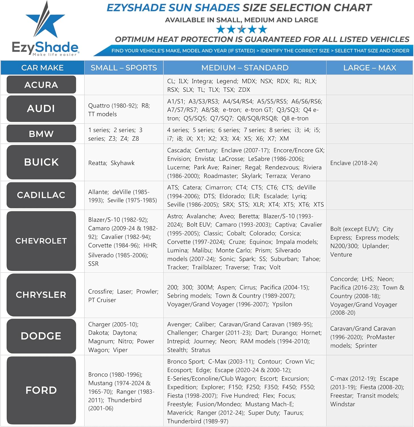 - Best Coverage Best Fit: Find your vehicle in the comprehensive Vehicle Size Chart. EzyShade Sunshades are 2 identical rectangular shades allowing for maximum adaptability to your car’s windshield. You can install vertically or horizontally to achieve the perfect fit.