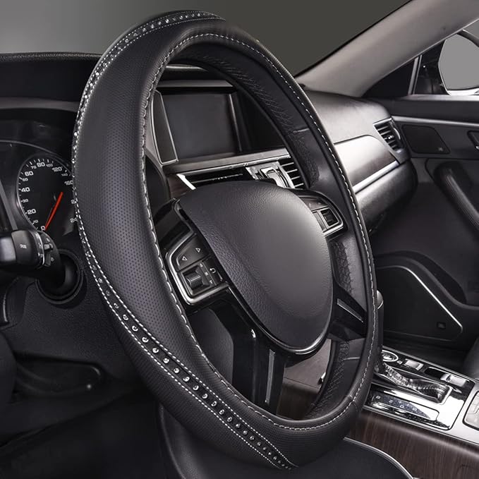 - EASY INSTALLATION: This studded sliver diamond steering wheel cover requires hassle-free installation (You can refer to the installation instructions on our product page). Simply slip it right on to your steering wheel and your good to go. Just place the cover on top of the steering wheel. Press and hold the upper part of the cover and gradually lower it with both hands on either side to tighten.