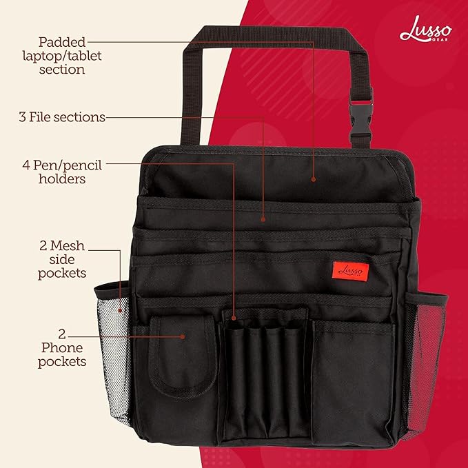 - Fits Any Vehicle: Installing our Lusso Gear Car Front Seat Organizer is easy! Simply attach strap to the passenger carseat headrest and adjust to your preferred height. Works with your car, truck, van, SUV, RV, camper, boat, semi, bus, cabs, taxis, and any other type of auto vehicle.