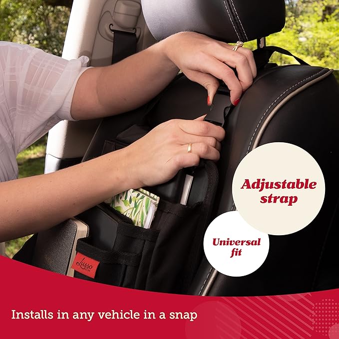 - Fits any vehicle: installing our lusso gear car front seat organizer is easy! Simply attach strap to the passenger carseat headrest and adjust to your preferred height. Works with your car, truck, van, suv, rv, camper, boat, semi, bus, cabs, taxis, and any other type of auto vehicle.