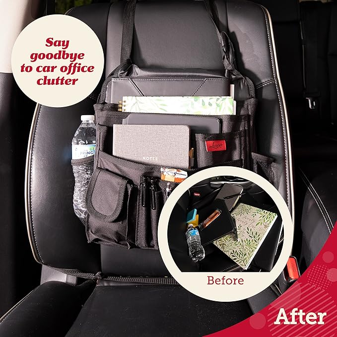 - Organize your backseat office: declutter your front seat and conveniently organize and pack your essential office and travel supplies neatly in your vehicle! Luxury holder for laptop, ipad, tablet, mobile phone, cup, book, pens, chargers, gadgets, and other accessories!
