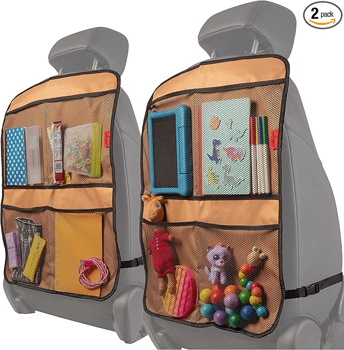 Lusso Gear Kick Mats (2 Pack) - Car Seat Back Protectors, Premium Waterproof Fabric, Reinforced Corners to Prevent Sag, and 4 Mesh Pockets for Large Storage (Tan)