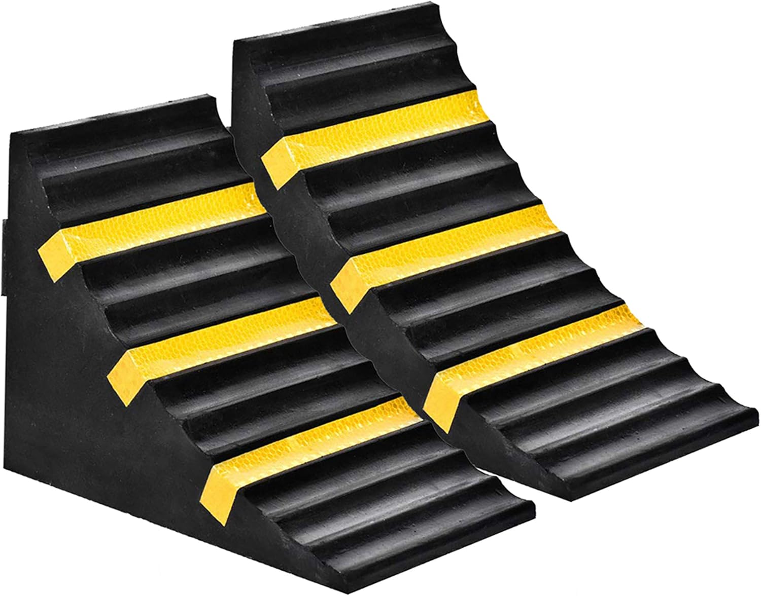 - 【Three High-visibility Reflective Strips】Three high visibility reflective tape on each wheel chocks,will deflect light from headlights, flashlights, phone lights,and more,can be visible from any angle, day or night,make the rubber wheel stops very eye-catching and provide high visibility & additional safety to passers-by.Great for indoor or outdoor environments such as garages, schools, warehouses and other commercial parking lots