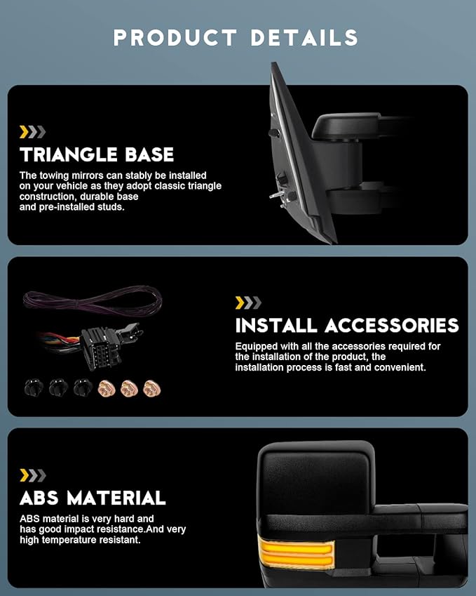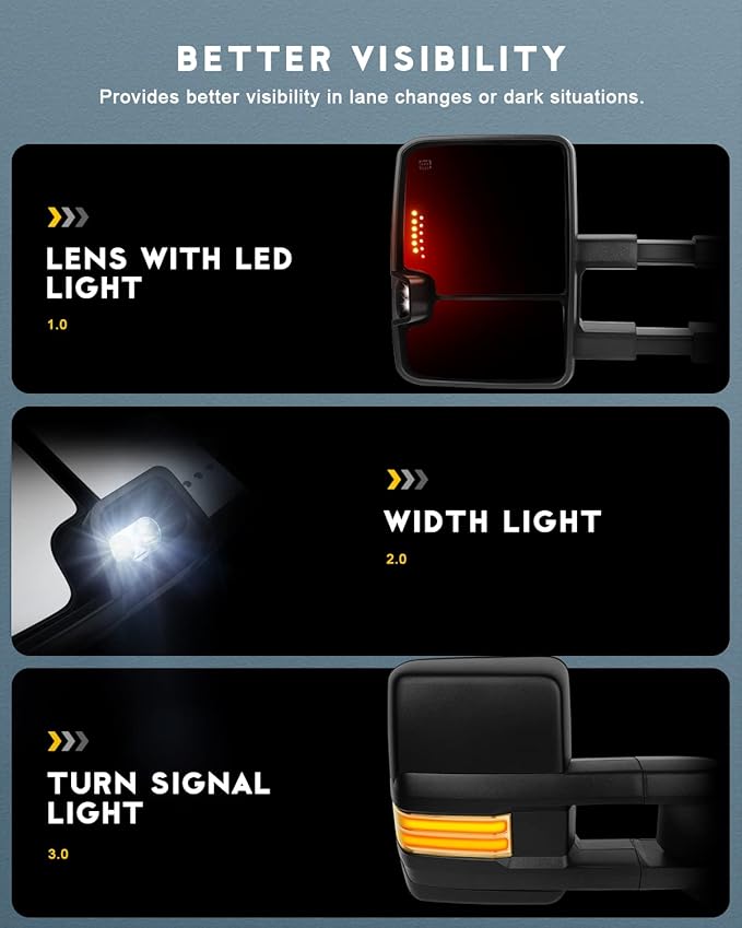 - Special Feature : Power Adjusted,Heated,LED Turn Signal Light,Running Light,Width Lamp,with Black Cap Housing,Manual Telescoping and Folding Power Adjusted,Heated,LED Turn Signal Light,Running Light,Width Lamp,with Black Cap Housing,Manual Telescoping and Folding