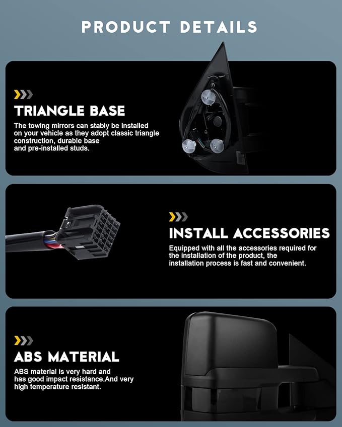 - Features-Adjustment-This Is A Power Mirrors, So You Can Adjust The Angle Of The Mirror With The Button Inside Your Vehicle. It Only Applies To Vehicle That Already Have Power Mirror Feature.Heated-Heated Mirror Cleans Frost And Ice, Making It Possible To See Clearly Even In Extreme Weather. Clear Vision, Reduce Visual Blind Area.â‘£Turn Signal- Amber Arrow Light In The Lower Mirror Will Turn On When Turn Signal Is Activated, Ensure Others Could Notice
