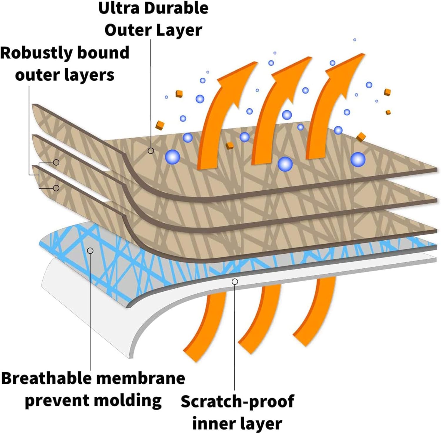 - Structure of 5 Bonded Layers; heavy-duty outer layer; double cushioning padded layer; protective supporting layer(layer 1, 2, 3 is robustly bonded with a high level of adhesion.); soft non-scratch inner layer (fleece lining).