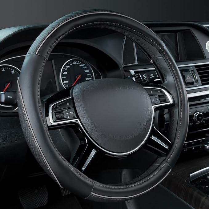 Car Pass Color Piping Microfiber Leather Universal Fit Steering Wheel Cover,Perfectly fit for 14.5-15 inches Suvs,Vans,Trucks,Sedans,Cars,Automotive(Black & Gray or Grey)