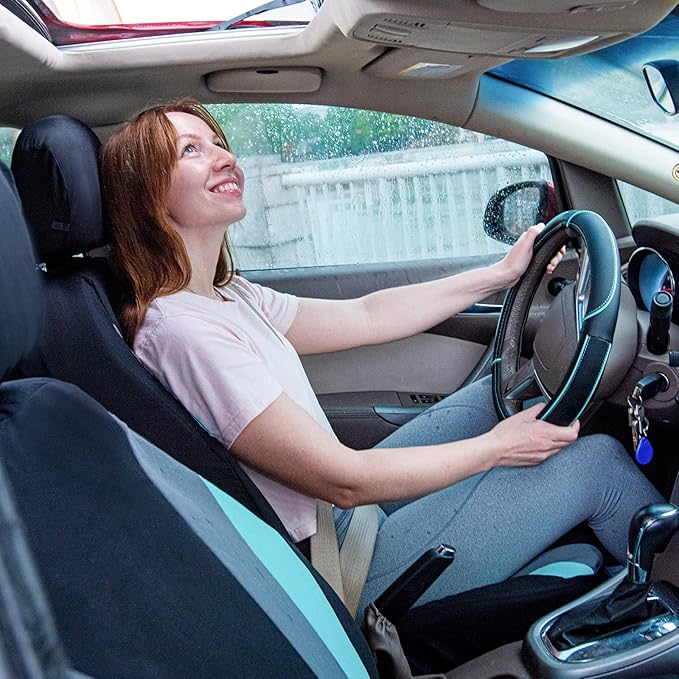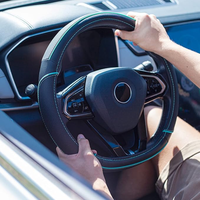 - SPORTY DESIGN WITH PIPING COLOFUL LEATHER:Feel Very comfortable when driving.Protect your hands from burning hot steering wheels in summer and ice cold ones in winter.