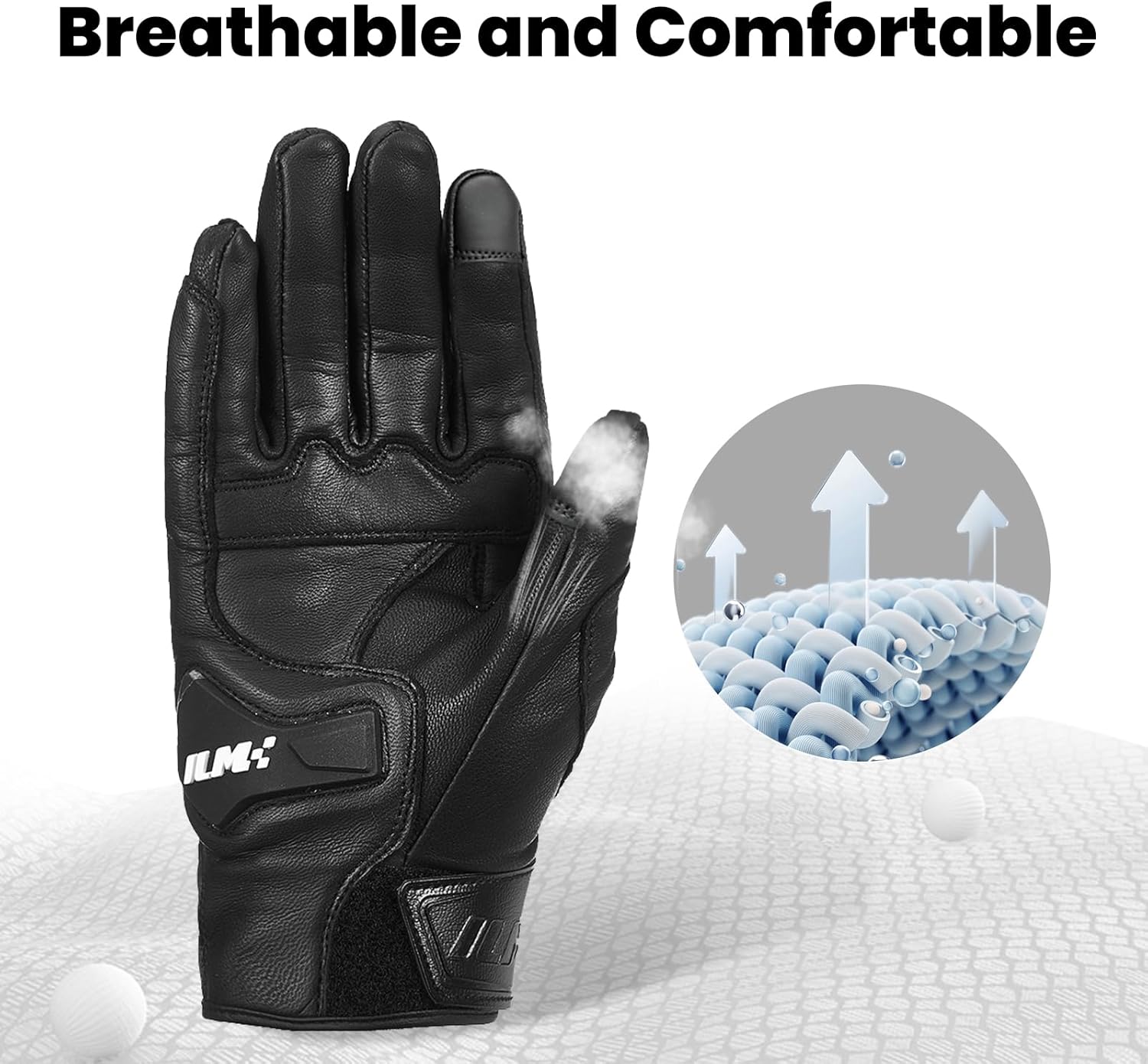 ILM Goatskin Leather Motorcycle Motorbike Powersports Racing Gloves Touchscreen for Men and Women Model DN01(L, Black Unperforated)
