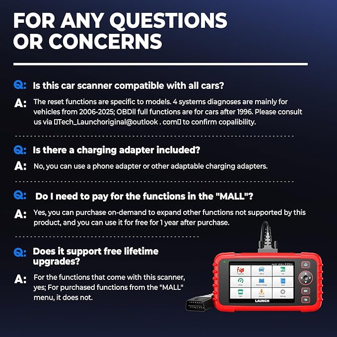 - [πππ ππ πππ & ππππ ππ ππππ πππππ] As the largest LAUNCH officially certified seller on Amazon for 8 years, we prioritize user experience and strive to meet your expectations. If you have any questions, please reach out πTech_Launchoriginal @ outlook . com πfor assistance. We are available 24/7/365 to support you and offer the following: a 5-year brand warranty, lifetime free update and lifetime technical support.