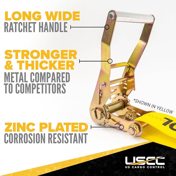 - INDUSTRIAL GRADE RATCHET HANDLE - The heavy duty 2 inch tie down straps have wide ratchet handles to provide a firm grip for easy tightening. All ratchets include zinc plating for protection against weather elements, UV rays, rust, and road debris.