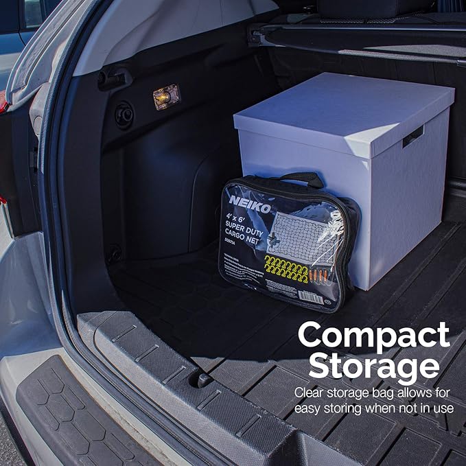 - HEAVY DUTY CARGO NET: This truck cargo net set comes with a convenient zipper storage bag for hassle-free and easy storage under your seat. 16 pc adjustable placement nylon hooks, 4 pc metal D clip carabiners designed with tight 4x4 mesh squares.