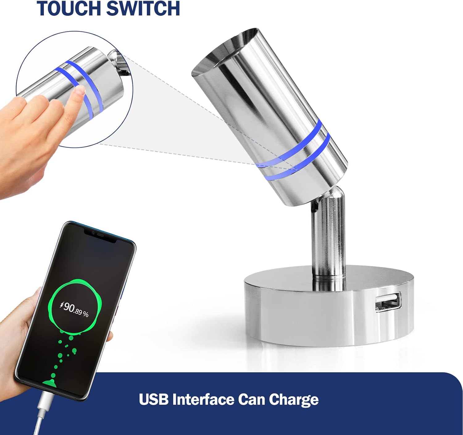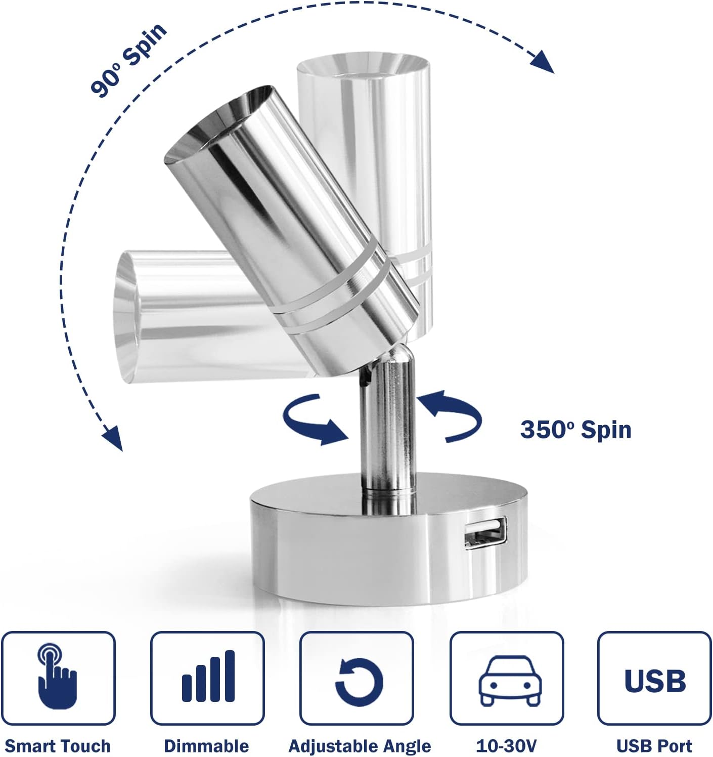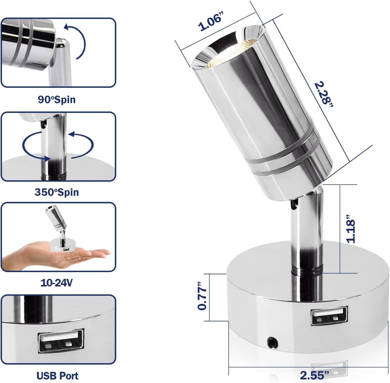 THALASSA 12V Interior LED RV Reading Lamp with 5V USB Port - Built-in Touch Switch, Dimmable Brightness, Surface Mounted on Wall Headboard of Boat Camper Van Travel Trailer Truck Cars Interior Light