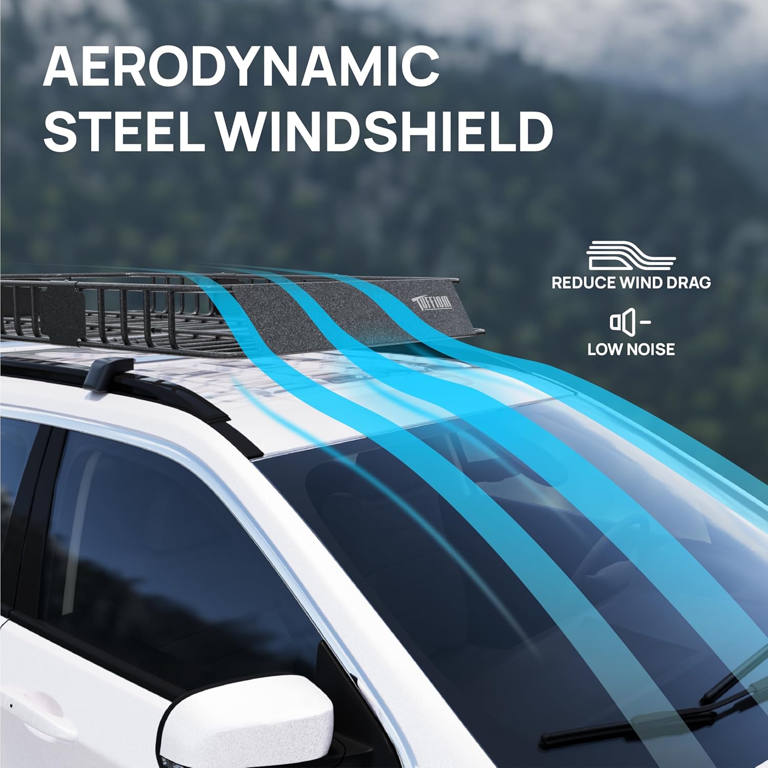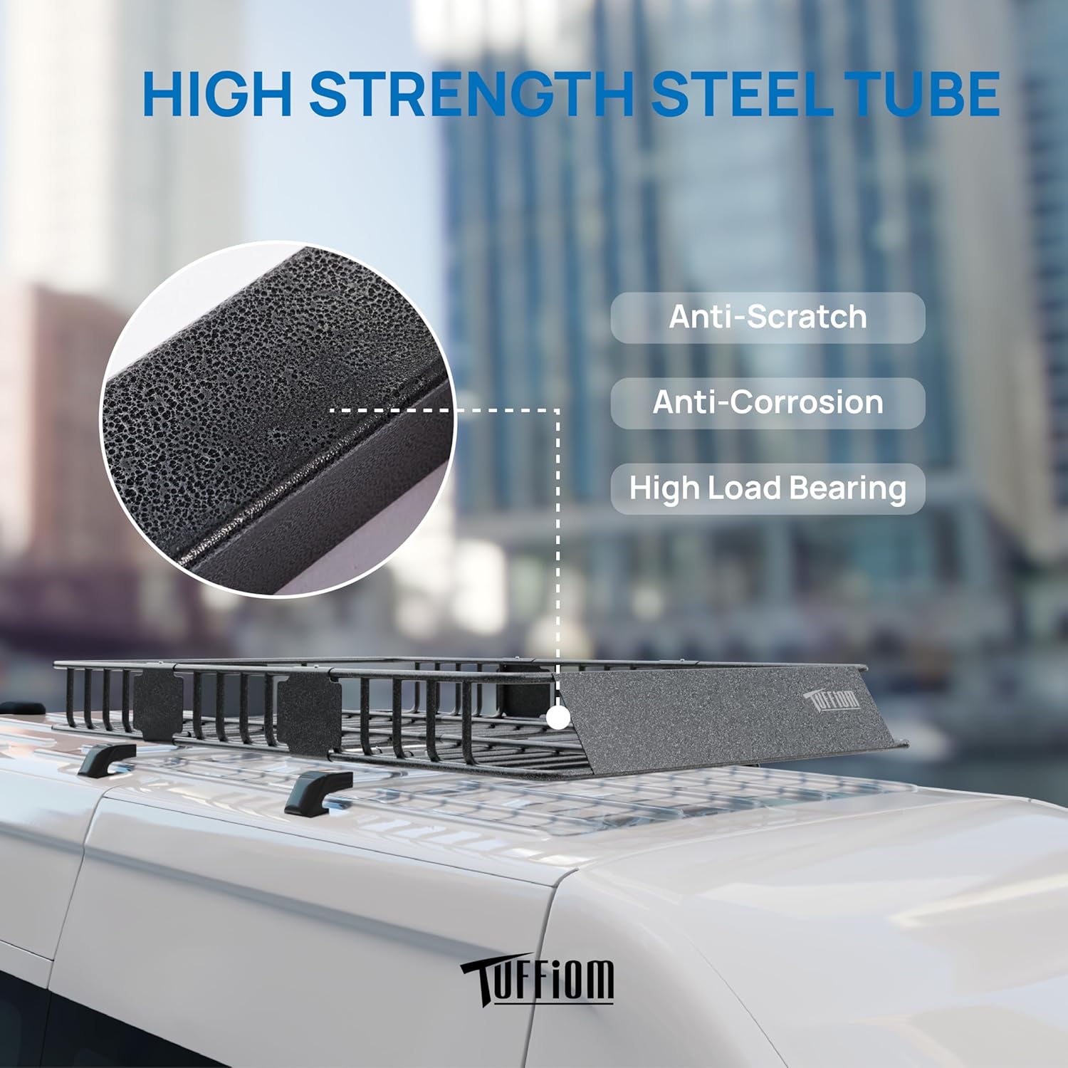 TUFFIOM 250lbs 64 x 39 x 6 inch Extendable Roof Top Cargo Carrier Basket w/Net+Storage Bag+Footrest+Straps, Heavy Duty Rooftop Luggage Holder Steel Rack for SUV Car Truck Van Travel Camping
