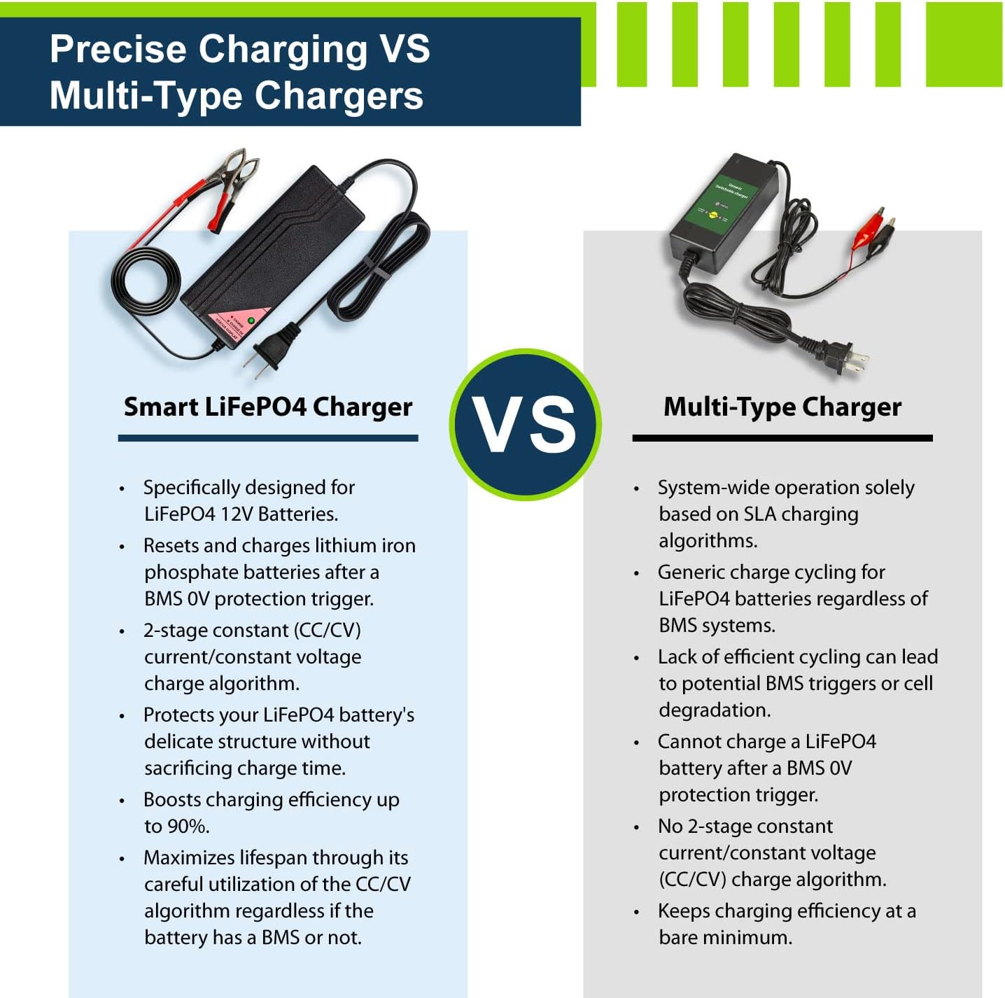 - Intelligently Programmed: Our charger is uniquely designed for 12V LiFePO4 batteries, implementing the special 2-stage constant current/constant voltage (CC/CV) charge algorithm with smart LED indicators. Additionally, the charger is designed to reset all types of BMS when active by allowing current into batteries reading from down to 0V