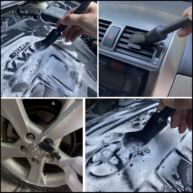 - š 5Pcs car detailing brush: 5Pcs different brush sizes, you can choose any one to suit your needs, enough length for easily exploring and reaching into the lug nuts, narrow or tight space.Great for both interior and exterior detailing.