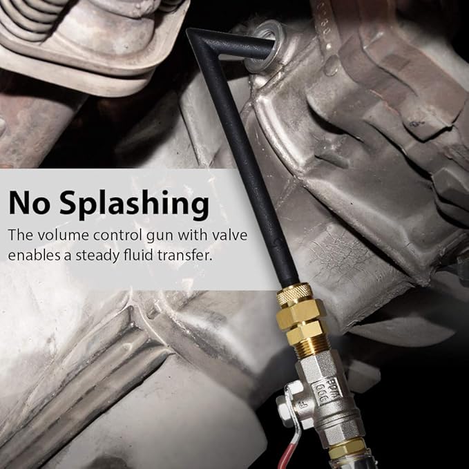 - 【 Convenient Design 】Hose with internal spring to prevent from being kinked; valve on hose end to control pressure and volume to be introduced into transmission. Without any splashing when operating. Complete designed tank base for stable operation and easy pumping action.