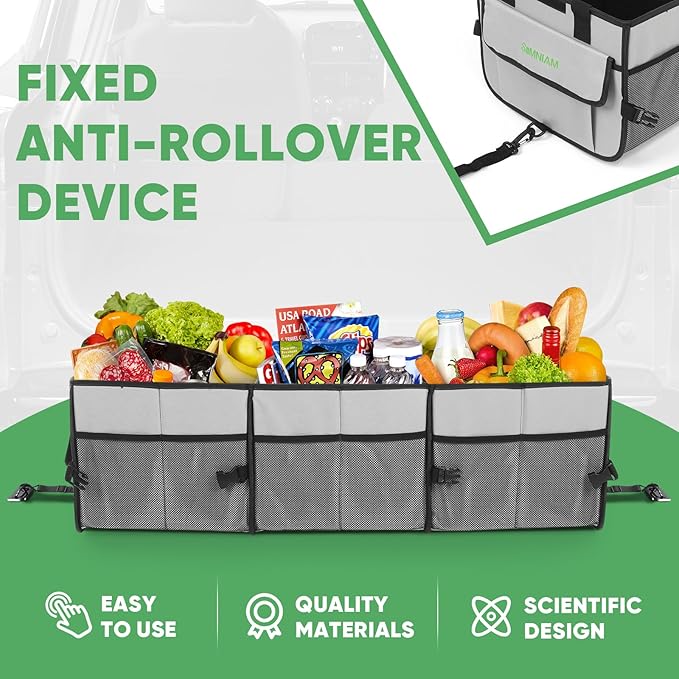 - šćDETACHABLE & COLLAPSIBLE DESIGNć- The trunk storage organizer is collapsible. It composes of 3 compartments in total, but you can adjust the size of the trunk organizer by adjusting the side rugged buckles. The trunk organizer can also be folded as large as a normal laptop bag