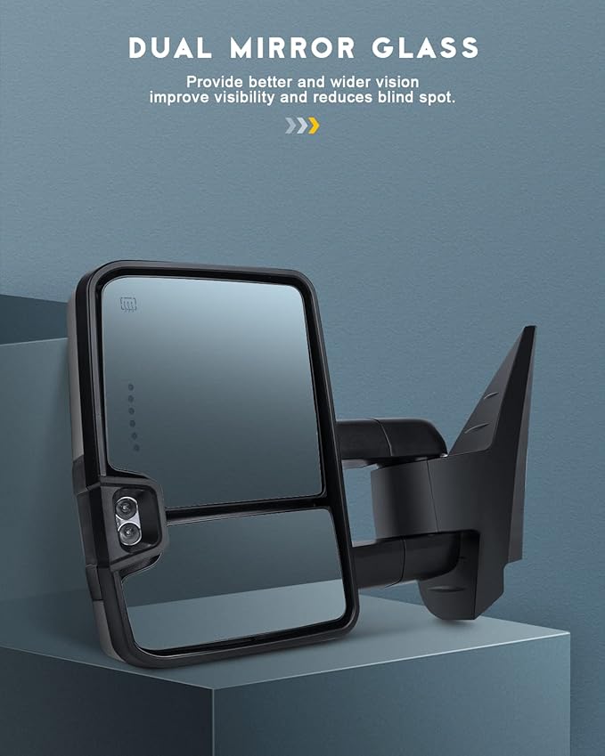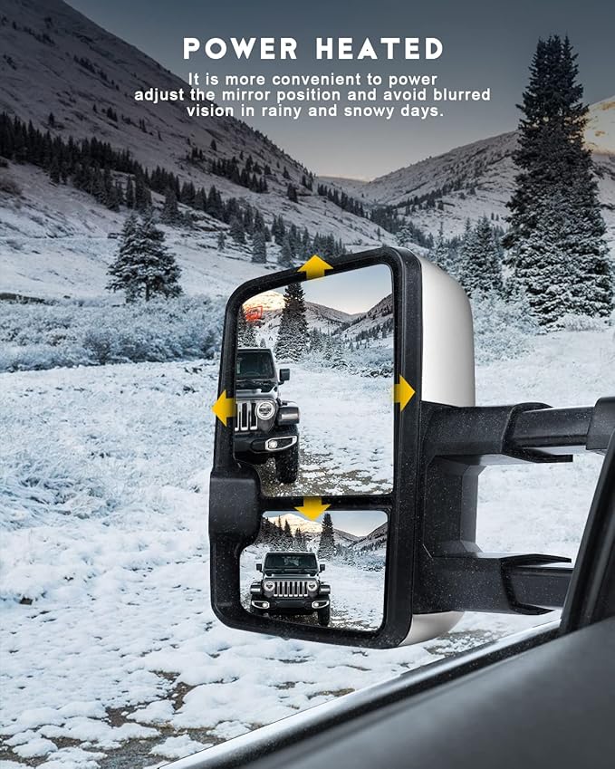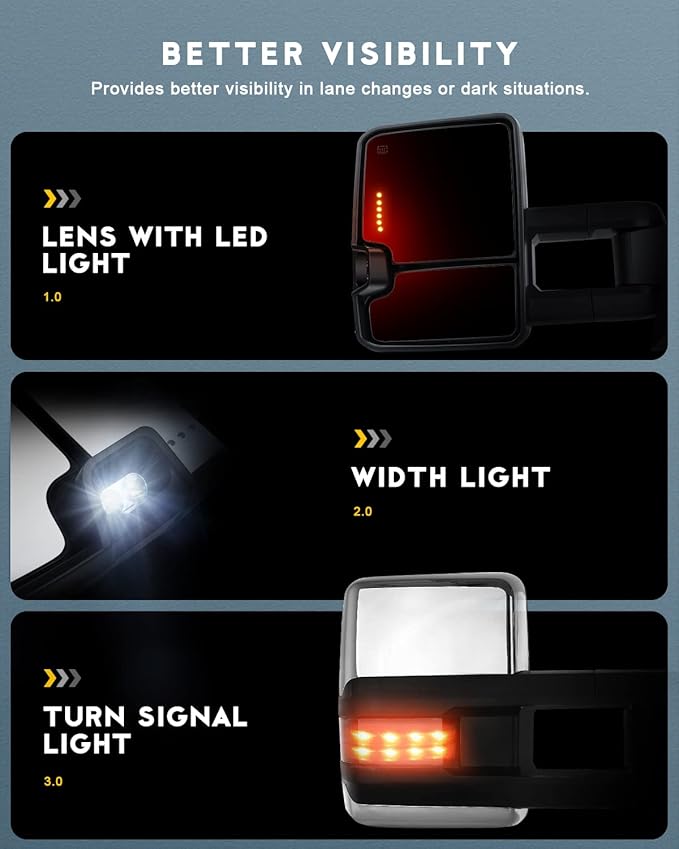- Main Features: Our Towing Mirrors Are Power One.So You Can Operate Directly In The Car, ItβS Very Convenient And Efficient.Chrome,Power Adjusted Mirror.With Heated Defrost, Turn Signal Light,Lens With Led Light,Width Lamp,Manual Folding, Manual Telescoping. Dimensions: Side Mirror Length Is 18.5β (Closed) And 21.26β (Extended); Side Mirror Size Is 12βΓ8.89