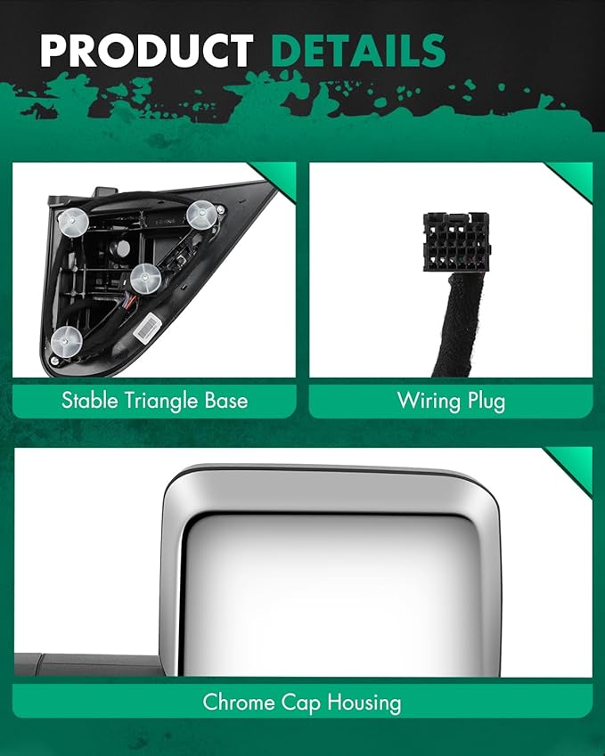 - 🛒FUNCTION - Power control-big glass,Heated Function,LED Turn Signal Light,Running Light,Back Up Light,Manual Telescoping and Folding,with Chrome Housing, side mirror length is 18” (closed) and 20.8” (extended); side mirror size is 12”×8.8.