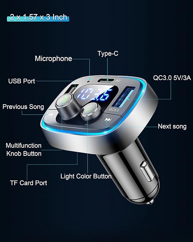 - [Type-C & QC USB Charger] This Bluetooth car adapter can fast charge 3 devices simultaneously via the USB-C (PD 3.0), QC 3.0 USB port, and normal USB A port(use only charging cable). Compatible with iPhone, iPad, Samsung, and Google. Offering a high-speed and efficient charging solution.